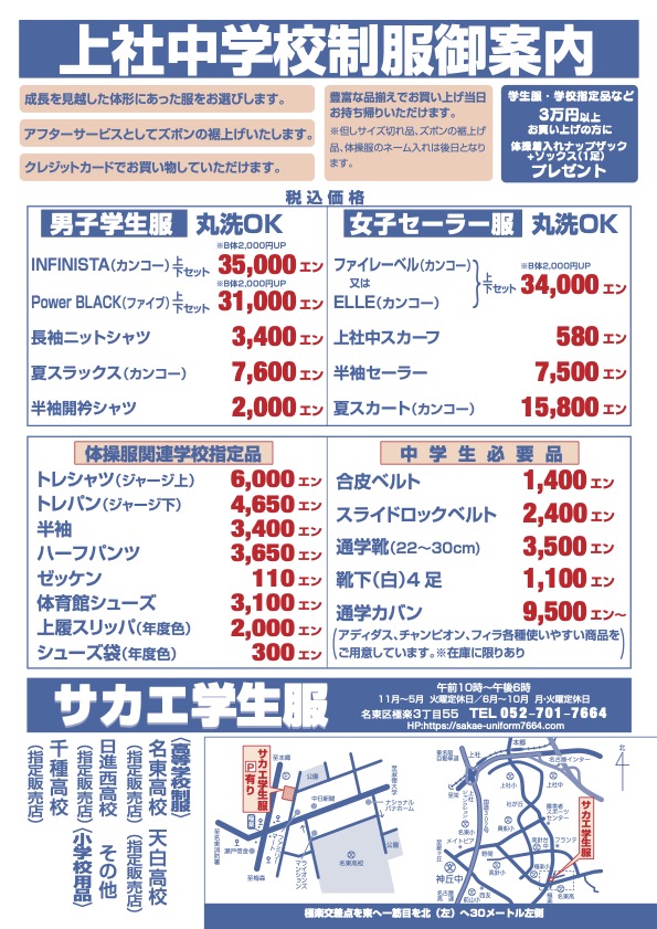 上社中学校 制服料金