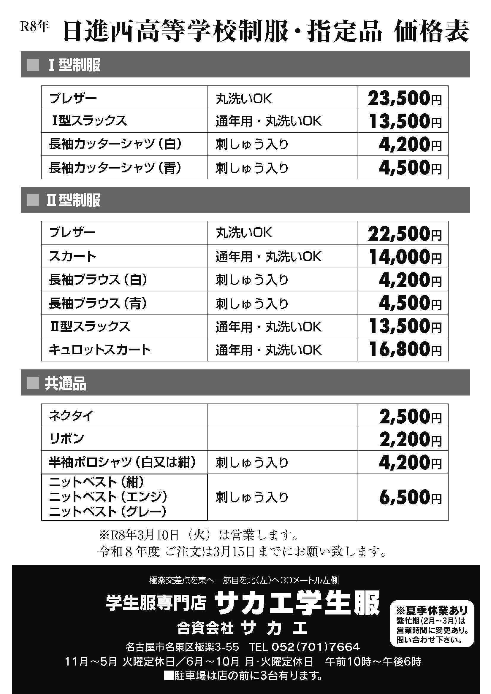 天白高等学校 制服価格表